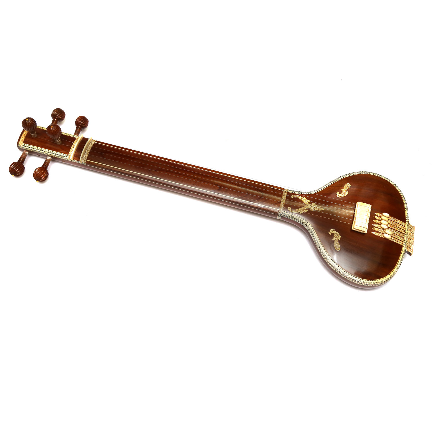The tanpura (or tambura, tanpuri) is a long-necked plucked string instrument found in various forms in Indian music; it does not play melody but rather supports and sustains the melody of another instrument or singer by providing a continuous harmonic bourdon or drone. A tanpura is not played in rhythm with the soloist or percusionist: as the precise timing of plucking a cycle of four strings in a continuous loop is a determinant factor in the resultant sound, it is played unchangingly during the complete performance. The repeated cycle of plucking all strings creates the sonic canvas on which the melody of the raga is drawn. The combined sound of all strings is very rich in harmonics that will enhance the resonance of the tones sung or played to the accompaniment of a fine tanpura.